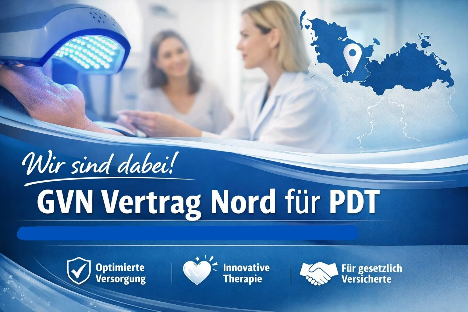 Wir nehmen Teil am GVN! Die Behandlung von Lichtschäden mittels photodynamischer Therapie wird jetzt von einigen gesetzlichen Krankenkassen übernommen.