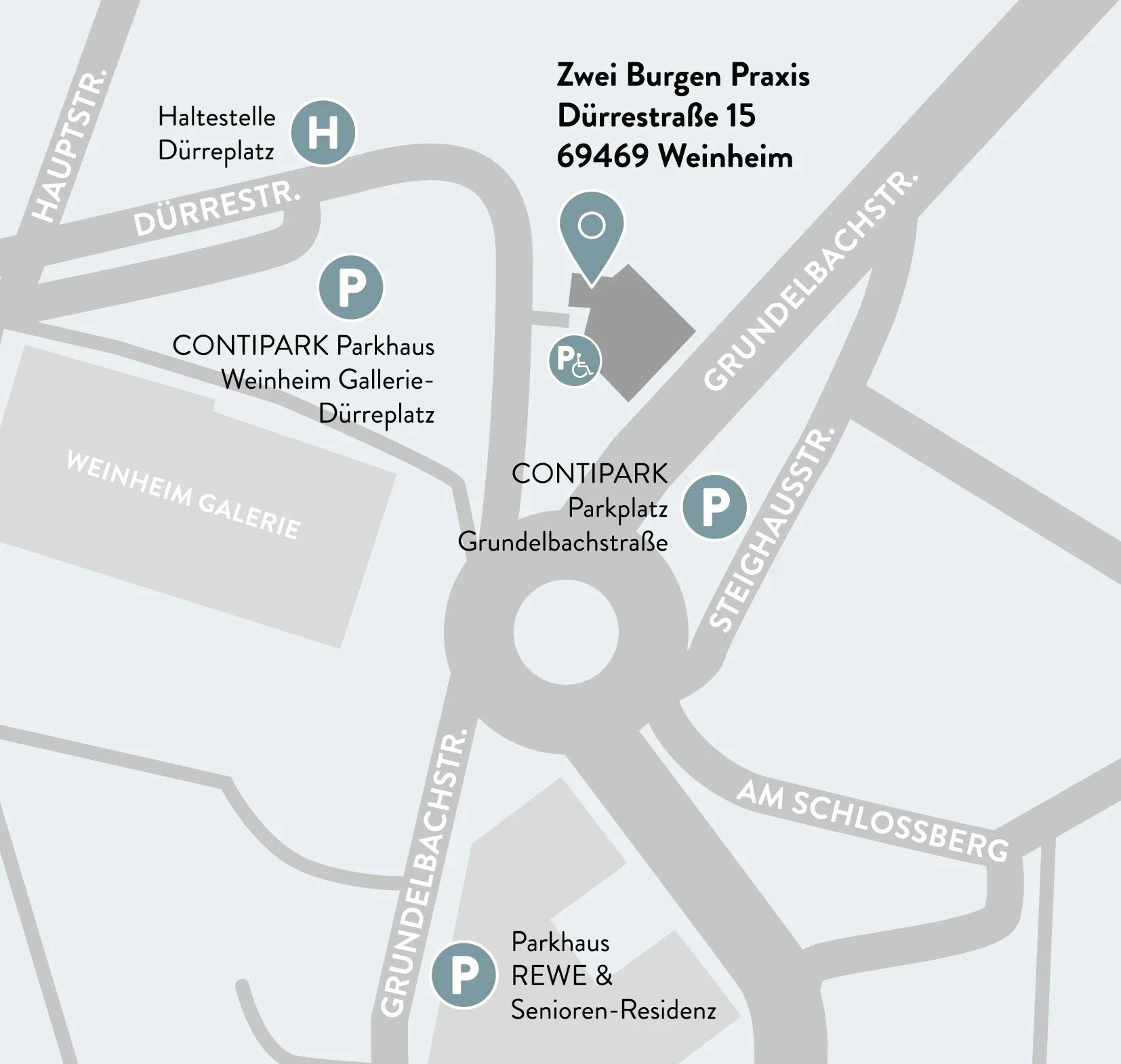 Wir empfehlen, das Parkhaus in der Weinheim Galerie am Dürreplatz zu nutzen. Alternativ gibt es ein Parkhaus am Rewe und der Seniorenresidenz in der Grundelbachstraße, einen Parkplatz in der Grundelbachstraße direkt unterhalb der Praxis oder das Parkhaus der Karlsberg Passage.